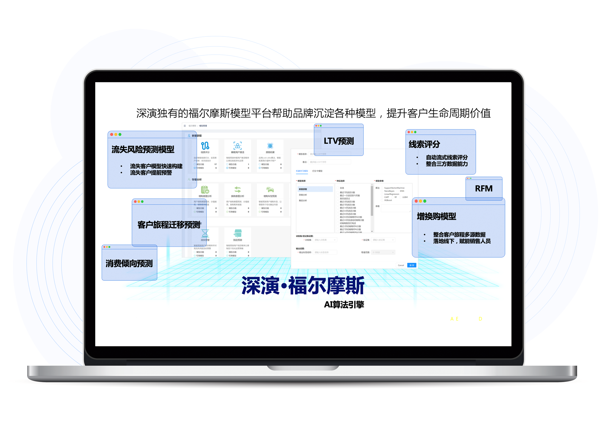 福尔摩斯AI是BB视讯智能自主研发的AI算法模型平台,内嵌广告和用户运营两大模型体系,为BB视讯智能营销决策云提供底层能力支撑,提升客户全生命周期价值